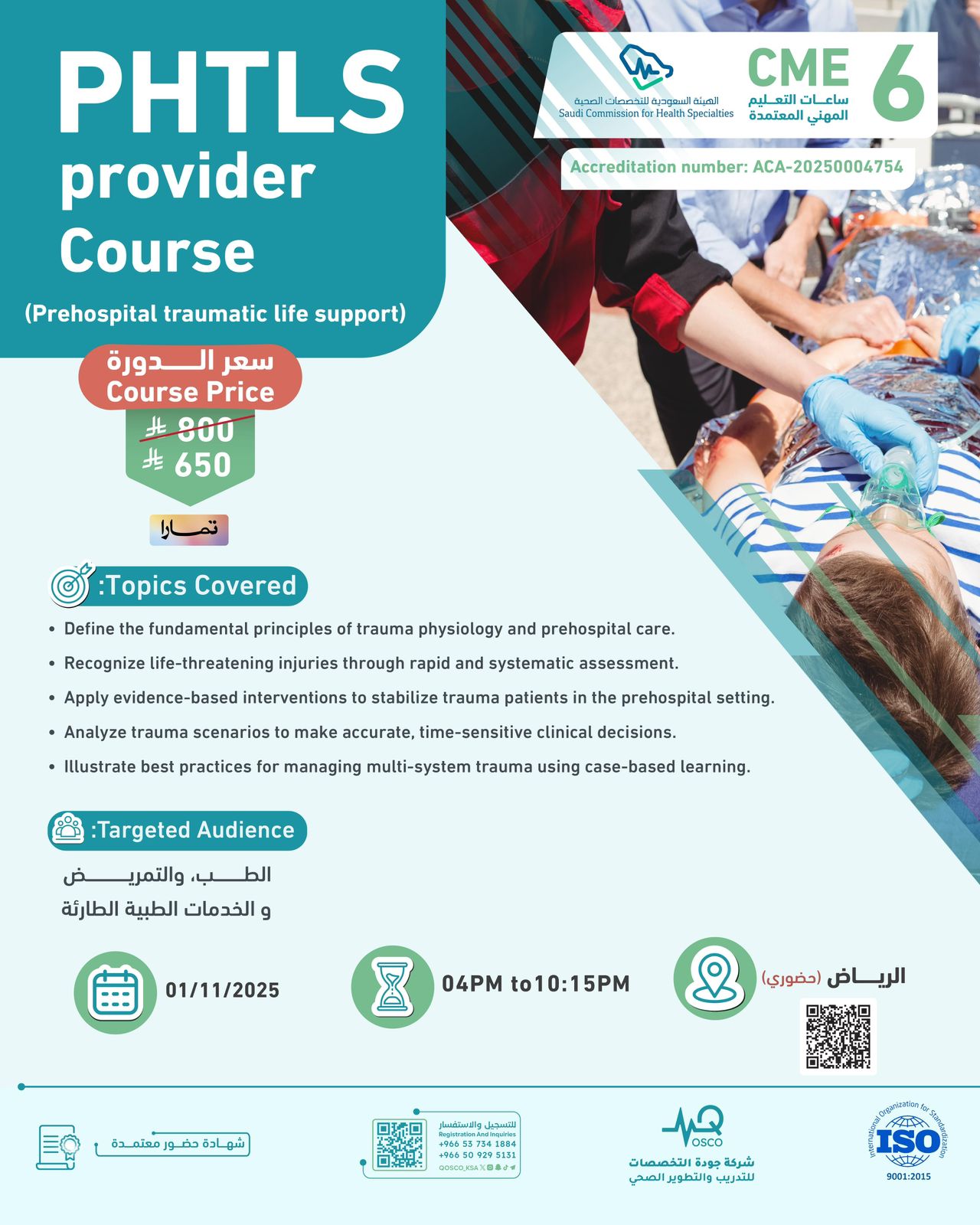 دعم الحياة ما قبل المستشفى للإصابات " PHTLS " الرياض