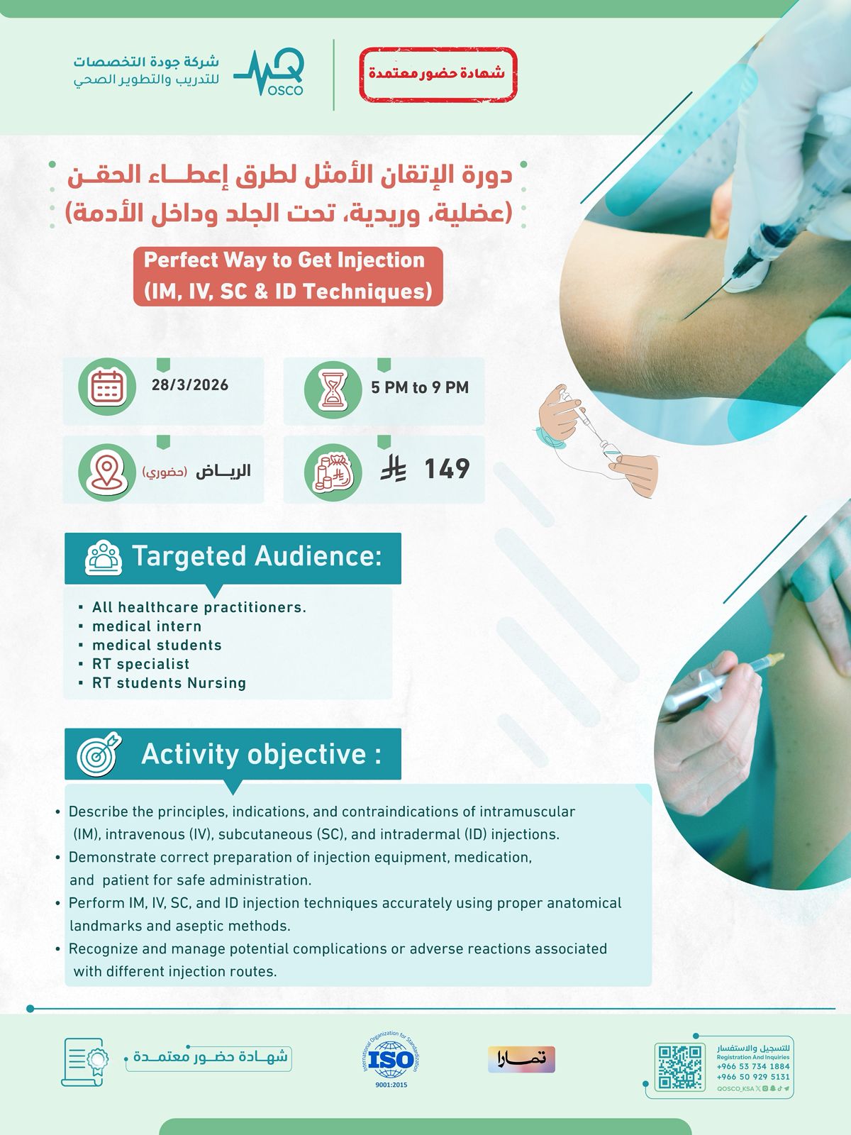 دورة الإتقان الأمثل لطرق إعطاء الحقن (عضلية، وريدية، تحت الجلد وداخل الأدمة) - 3️⃣